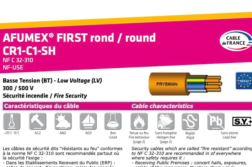 Câble de sécurité “résistant au feu” conforme à la norme NF C 32-310 et recommandé dans les ERP et les IGH.